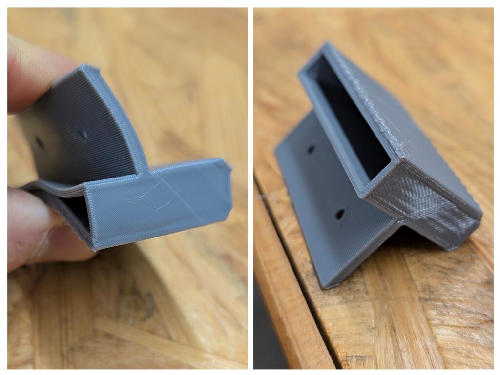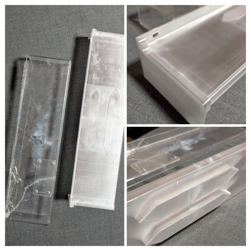 Hier wurde eine defekte Abdeckung rekonstruiert und mittels 3D-Druck aus transparentem PETG neu gefertigt, wobei Verbinder an der Unterseite und Klebstoff für eine stabile Verbindung sorgen.